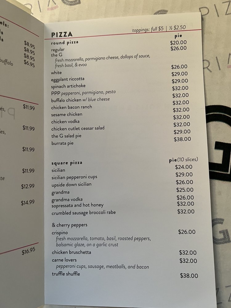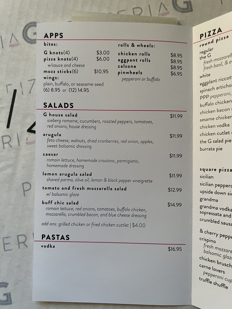 Welcome to Pizzeria G, where deliciousness meets accessibility in Garden City, NY. This trendy spot offers a diverse menu featuring classic and innovative pizzas, scrumptious sandwiches, and fresh salads—all available for delivery or takeout. Whether you're seated indoors or enjoying the heated outdoor space, the casual atmosphere and friendly staff create a welcoming experience.
